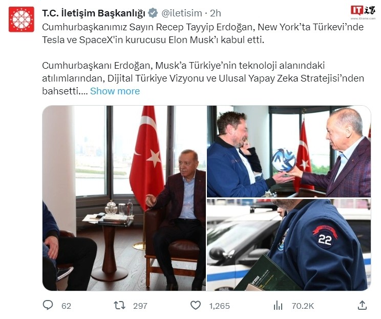 土耳其總統府通訊局在 X(推特)上發(fā)文表示,土耳其總統雷杰普?塔伊普?埃爾多安在紐約圖爾克維酒店接見(jiàn)了埃隆?馬斯克,他向馬斯克介紹了土耳其在技術(shù)方面的突破、數字土耳其愿景和國家人工智能戰略。