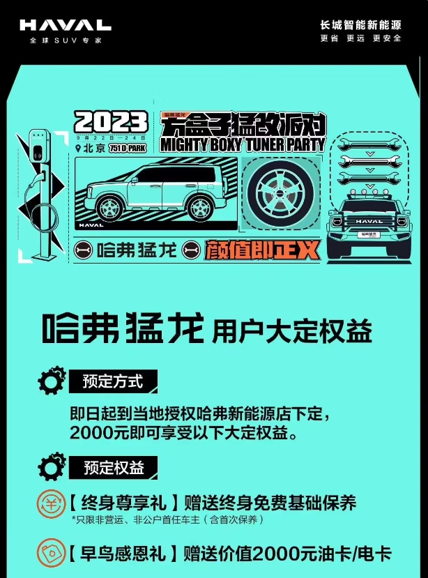 哈弗猛龍大定權益正式發(fā)布,即日起到當地授權哈弗新能源店下定,2000 元即可享受以下大定權益。