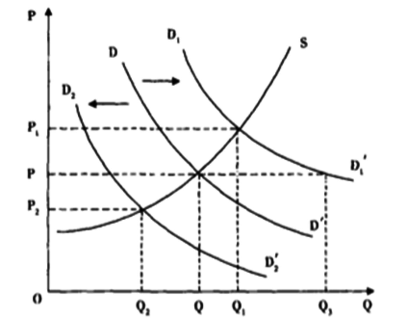而當經(jīng)濟周期處于滯脹期時(shí),消費者降低消費預算,尤其是降低對可消費品的預算,這時(shí)候 DD'曲線(xiàn)左移為D?D?’,新的需求曲線(xiàn)與供給曲線(xiàn)曲線(xiàn)S,給出新的供需平衡點(diǎn)——更低的價(jià)格P?,更少的數量Q?。