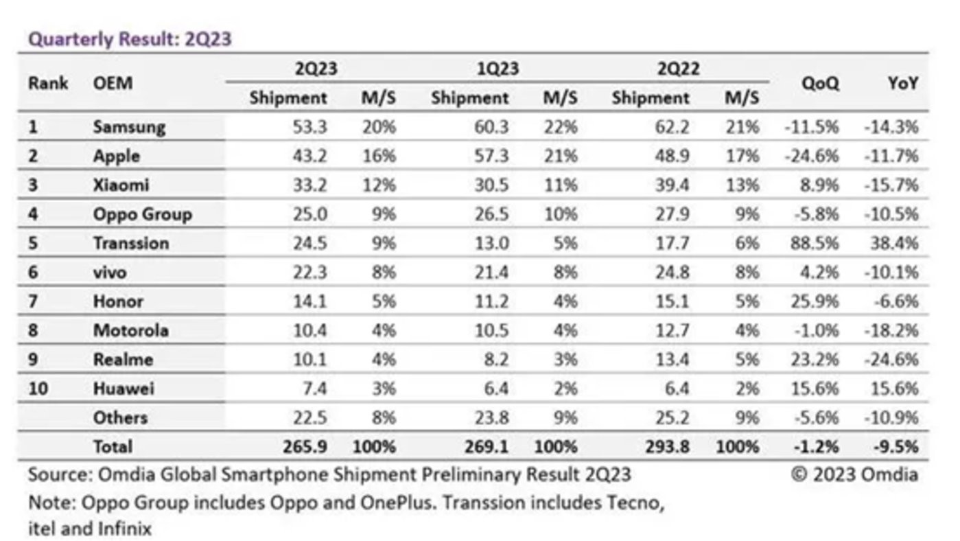 圖:2023Q2 全球智能手機市場(chǎng)出貨量