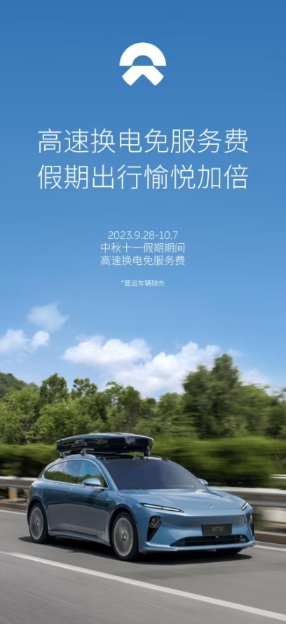 蔚來(lái)今日宣布,9 月 28 日至 10 月 7 日的假期期間將實(shí)行高速換電免服務(wù)費政策(營(yíng)運車(chē)輛除外)。