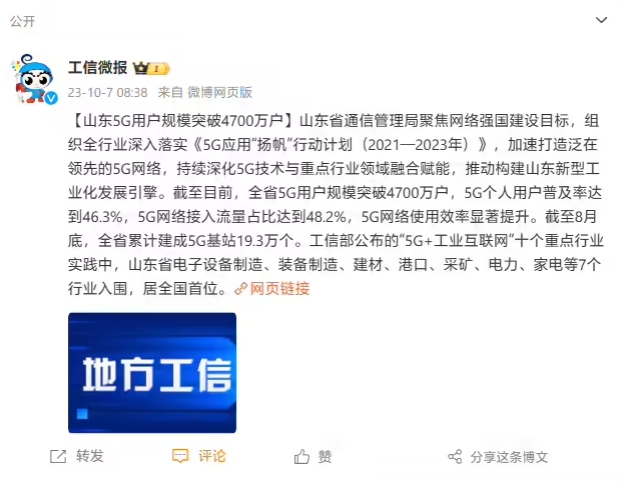 @工信微報 今日上午通過(guò)微博發(fā)文表示,截至今年 9 月底,山東全省 5G 用戶(hù)規模突破 4700 萬(wàn)戶(hù),5G 個(gè)人用戶(hù)普及率達到 46.3%,5G 網(wǎng)絡(luò )接入流量占比達到 48.2%,5G 網(wǎng)絡(luò )使用效率顯著(zhù)提升。