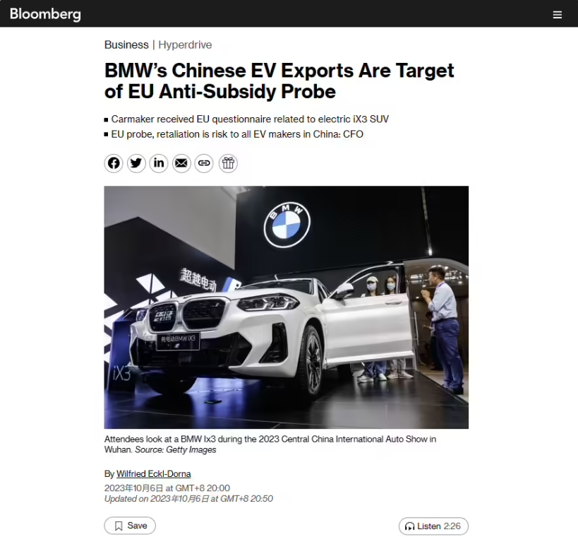 歐盟上月宣布對中國電動(dòng)汽車(chē)展開(kāi)反補貼調查,相關(guān)消息“一石激起千層浪”,引發(fā)各界人士極大的爭議。彭博社在當地時(shí)間周五的報道中聲稱(chēng),寶馬公司收到了歐盟關(guān)于其純電車(chē)型 iX3 的“信息請求”,這將是歐盟調查中國電動(dòng)汽車(chē)制造商補貼的一部分。