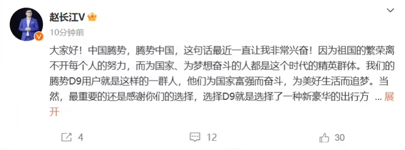 騰勢銷(xiāo)售事業(yè)部總經(jīng)理趙長(cháng)江今日在微博中宣布,截至目前,騰勢 D9 的用戶(hù)已超過(guò) 10 萬(wàn) +。騰勢 D9 此前已迎來(lái)專(zhuān)屬感恩季福利: