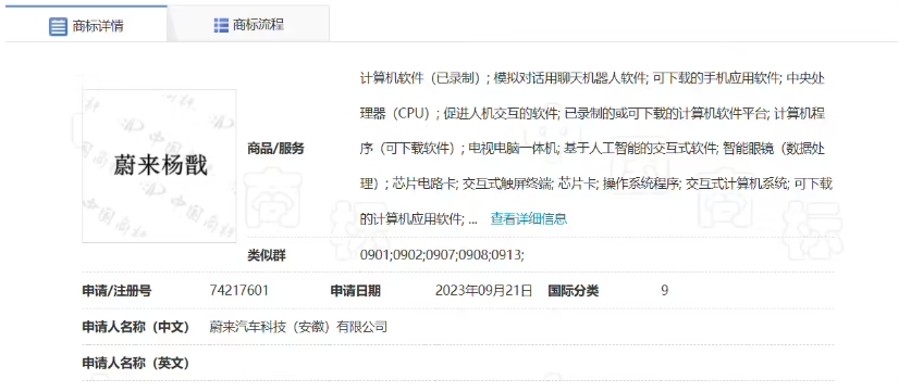 國家知識產(chǎn)權局商標局網(wǎng)站顯示,蔚來(lái)汽車(chē)科技(安徽)有限公司于 2023 年 9 月 21 日遞交了“蔚來(lái)楊戩”的注冊申請,國際分類(lèi)為科學(xué)儀器,當前商標狀態(tài)為等待實(shí)質(zhì)審查。