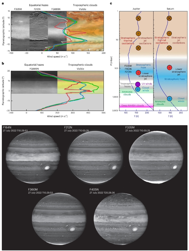 韋伯望遠鏡早期發(fā)布的科學(xué)計劃由加州大學(xué)柏克萊分校天文學(xué)家 Imke de Pater、巴黎天文臺天文學(xué)家 Thierry Fouchet 共同領(lǐng)導,旨在每隔 10 小時(shí)(木星的 1 天)用 4 種不同濾鏡拍攝木星照片,每種濾鏡都能檢測木星大氣層不同高度的微小特征變化。