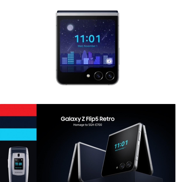 Galaxy Z Flip 5 Retro 身上有一些 SGH-E700 的元素,比如靛藍和銀色的配色,并在其 Flex Window 外屏上設計了一些懷舊的像素圖形、UI 和城市景觀(guān)動(dòng)畫(huà)。
