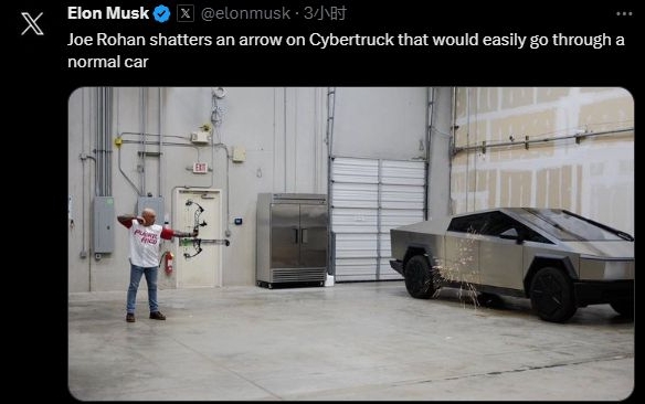 馬斯克還討論了 Cybertruck 的防護能力。之前有人在 Instagram 上分享了弓箭測試的結果,并開(kāi)玩笑說(shuō)“Cybertruck 也能抵擋弓箭了!”