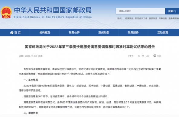 據國家郵政局官網(wǎng)消息,為加強快遞服務(wù)質(zhì)量監測,客觀(guān)反映企業(yè)服務(wù)水平,促進(jìn)快遞業(yè)提升發(fā)展質(zhì)效,國家郵政局組織第三方機構分別對 2023 年第三季度快遞服務(wù)滿(mǎn)意度、全國重點(diǎn)地區時(shí)限準時(shí)率進(jìn)行了調查和測試。