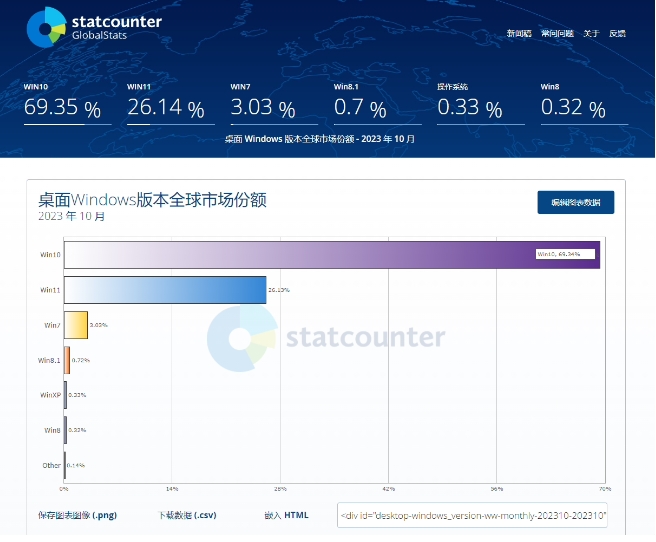 基于 StatCounter 公布的 10 月統計數據,Windows 11 市場(chǎng)份額已經(jīng)迎來(lái)顯著(zhù)上升,從 9 月份的 23.64% 攀升至 2023 年 10 月的 26.14%。此外,Win10 份額上個(gè)月下降了 2.27 個(gè)百分點(diǎn),但依然高達 69.35%。