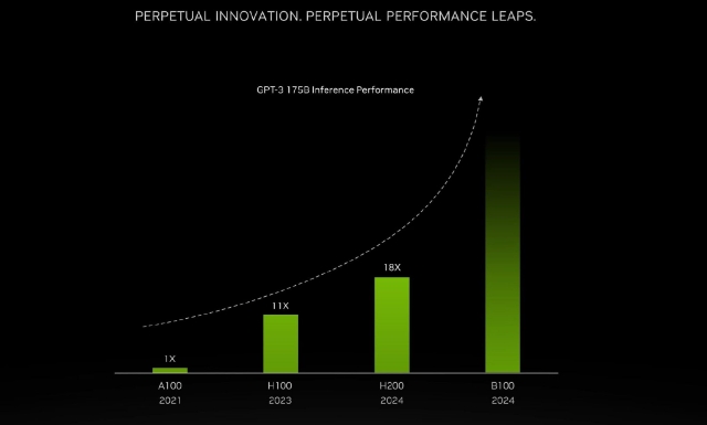 英偉達還透露,下一代Blackwell B100 GPU也將在2024年推出,性能已經(jīng)“望不到頭”。