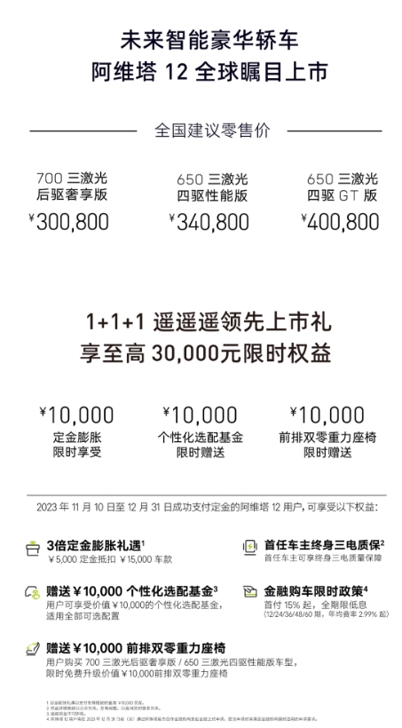 據了解,用戶(hù)在 12 月 31 日之前支付定金,可限時(shí)享受“1+1+1 遙遙遙領(lǐng)先上市禮”,包含 5000 元定金抵扣 15000 元車(chē)款、10000 元的個(gè)性化選配基金、贈送 10000 元前排雙零重力座椅。