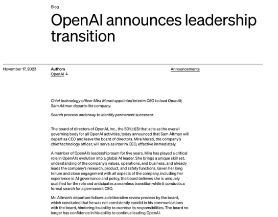 11月17日,因ChatGPT而名聲大噪的OpenAI在官網(wǎng)發(fā)布新聞稿稱(chēng),公司董事會(huì )宣布,CEO薩姆·奧特曼(Sam Altman)將辭去CEO并離開(kāi)公司,首席技術(shù)官米拉·穆拉蒂(Mira Murati)將擔任臨時(shí)首席執行官,立即生效。