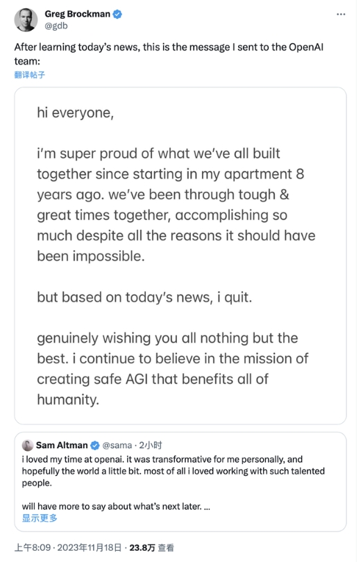 在奧特曼該推文后沒(méi)多久,布羅克曼轉發(fā)也宣布將離開(kāi)公司。