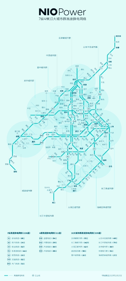 截至 11 月 23 日,蔚來(lái)已在全國累計建成 2127 座換電站,其中 660 座高速換電站,完成 7 縱 4 橫 10 大城市群高速換電網(wǎng)絡(luò )布局:G1 京哈、G2 京滬、G3 京臺、G4 京港澳、G5 京昆、G15 沈海、G30 連霍蘇陜段、G42 滬蓉、G45 大廣京廣段、G50 滬渝、G60 滬昆滬湘段和京津冀、長(cháng)三角大灣區、成渝、長(cháng)江中游、山東半島、關(guān)中、中原、晉中、海峽西岸。