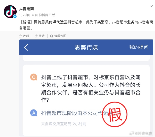 昨日,抖音電商辟謠:網(wǎng)傳思美傳媒代運營(yíng)抖音超市,此為不實(shí)消息。抖音超市業(yè)務(wù)為抖音電商自運營(yíng)。