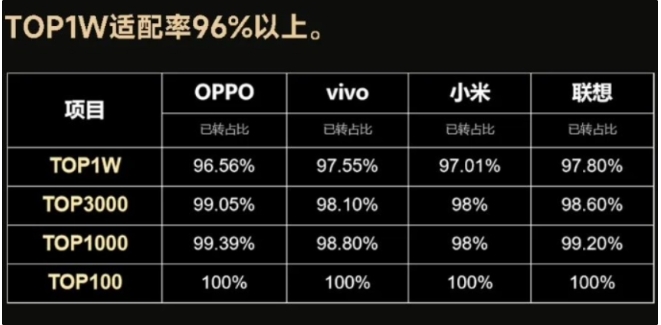 根據金標聯(lián)盟此前公布的數據,截至 12 月 1 日,OPPO、vivo、小米、聯(lián)想應用商店 TOP100 應用 100% 適配 64 位,TOP1000 應用 98% 以上適配 64 位,TOP3000 應用 98% 以上適配 64 位,TOP1W 應用 96% 以上適配 64 位。