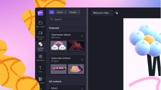 Clipchamp 還新增了一個(gè)內容庫標簽,能夠幫助用戶(hù)找到來(lái)自免費和付費庫的素材,并將其添加到視頻中。該標簽包含當下流行和最近使用的內容,以及按類(lèi)別分類(lèi)的內容。用戶(hù)還可以輸入想要查找的特定內容,例如節日主題的視頻、圖像或音頻剪輯。