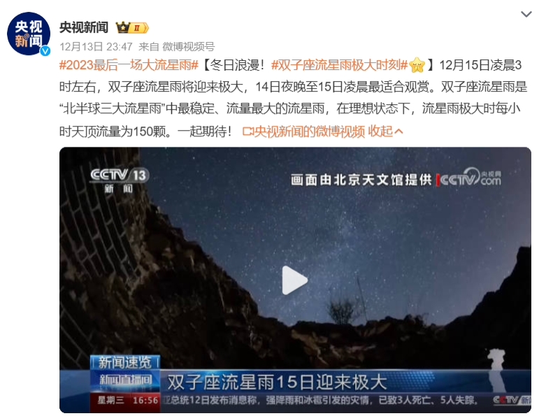 據央視新聞報道,明日(12 月 15 日)凌晨 3 時(shí)左右,雙子座流星雨將迎來(lái)極大,今晚至明日凌晨最適合觀(guān)賞。