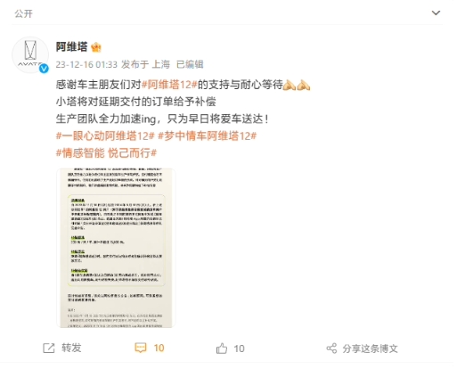 阿維塔今天凌晨在官微宣布將對延期交付的訂單給予補償,并稱(chēng)生產(chǎn)團隊正在全力加速。該車(chē)已在 12 月 10 日開(kāi)啟全國交付,陸續登陸 19 省 40 城。