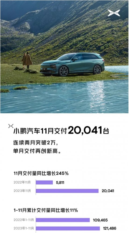 12月1日,小鵬汽車(chē)公布了最新交付數據。11月小鵬汽車(chē)共交付新車(chē)20041臺,同比增長(cháng)245%。小鵬G6交付8750臺,繼續領(lǐng)跑20萬(wàn)以上中國品牌純電動(dòng)SUV月銷(xiāo)量榜。今年以來(lái),小鵬汽車(chē)已連續10個(gè)月保持月交付正增長(cháng),截至11月末小鵬汽車(chē)2023年累計交付量達121486臺,超2022年全年累計交付量。
