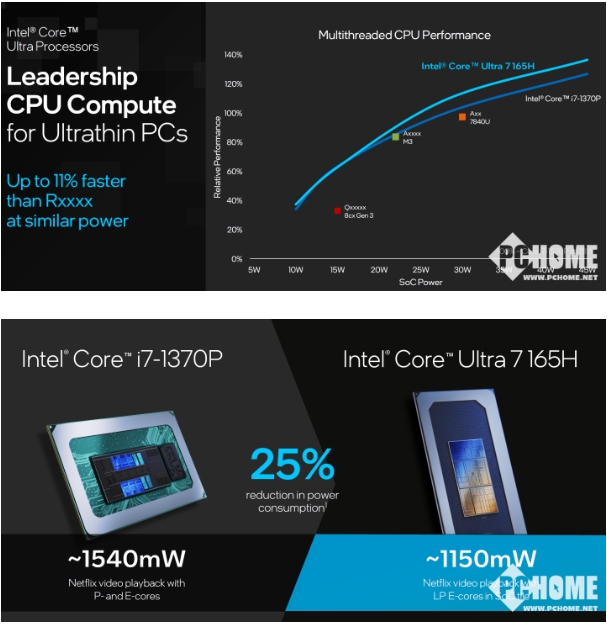 在SPECrate 2017中,與高通8cx Gen3、蘋(píng)果M3、銳龍7840U以及英特爾i7-1370P相比的話(huà),酷睿Ultra 7 165H在28瓦的功耗下,擁有更強的性能表現。相比i7-1370P可以降低25%的功耗。