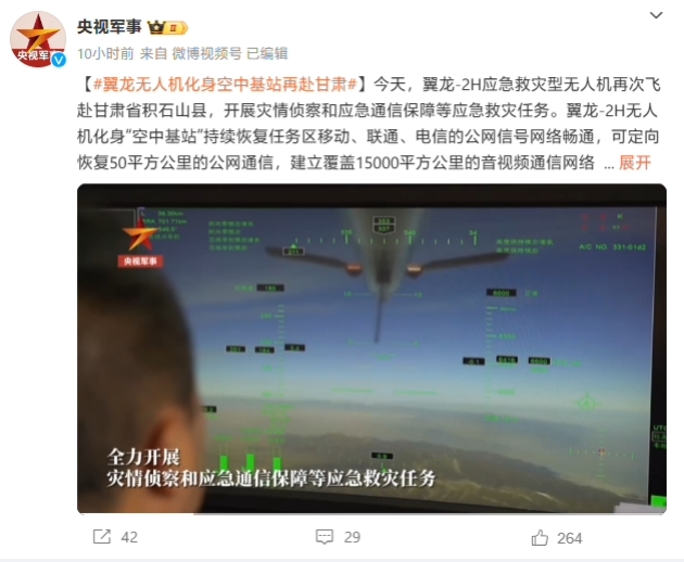 據央視軍事報道,翼龍-2H 應急救災型無(wú)人機 20 日從四川自貢蘭田機場(chǎng)起飛,再次飛赴甘肅省積石山縣,開(kāi)展災情偵察、應急通信保障等應急救災任務(wù)。