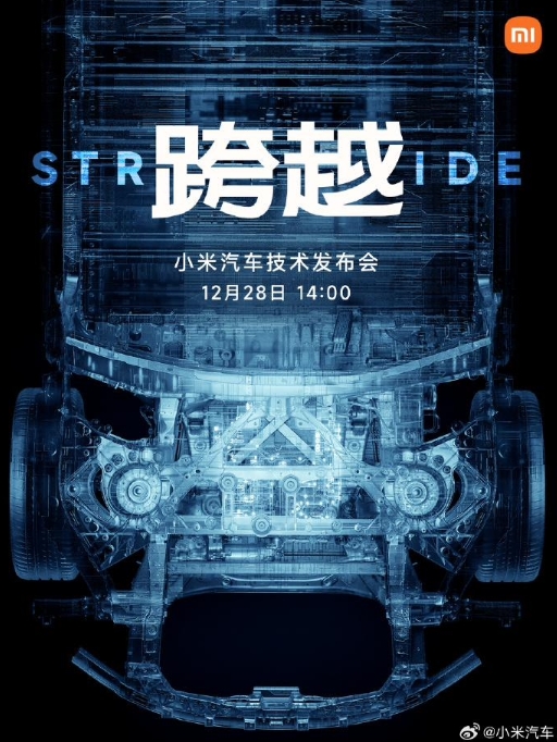 小米汽車(chē)技術(shù)發(fā)布會(huì )官宣 12 月 28 日下午 2 點(diǎn)舉行。官方放出了一張汽車(chē)底盤(pán)的預熱海報,配文“跨越 / STRIDE”。