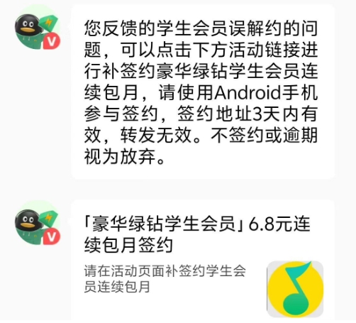 您反饋的學(xué)生會(huì )員誤解約的問(wèn)題,可以點(diǎn)擊下方活動(dòng)鏈接進(jìn)行補簽約豪華綠鉆學(xué)生會(huì )員連續包月,請使用 Android 手機參與簽約,簽約地址 3 天內有效,轉發(fā)無(wú)效。不簽約或逾期視為放棄。
