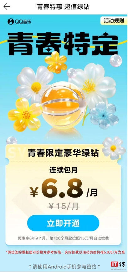 補簽約頁(yè)面顯示,青春限定豪華綠鉆連續包月價(jià)格仍為 6.8 元 / 月,優(yōu)惠享 8 年 9 個(gè)月,第 106 個(gè)月起按照 15 元 / 月自動(dòng)續費。