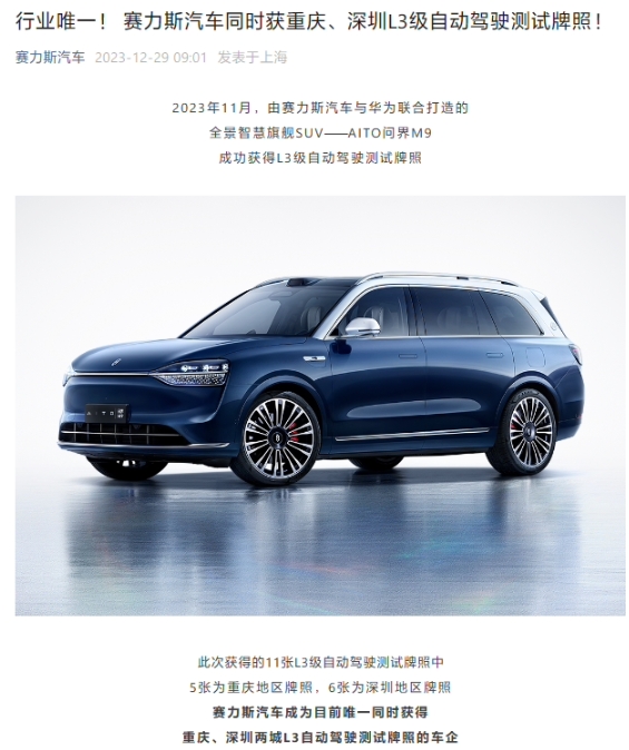賽力斯汽車(chē)今天上午發(fā)文宣布,2023 年 11 月,華為和賽力斯聯(lián)合打造的“全景智慧旗艦 SUV”問(wèn)界 M9 成功獲得 L3 級自動(dòng)駕駛測試牌照。