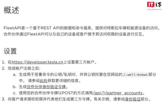 特斯拉在 2023 年 10 月推出了一款用于“車(chē)隊管理用途”的 Fleet API,并發(fā)布了一系列開(kāi)發(fā)文檔,便于開(kāi)發(fā)者創(chuàng )建第三方應用。