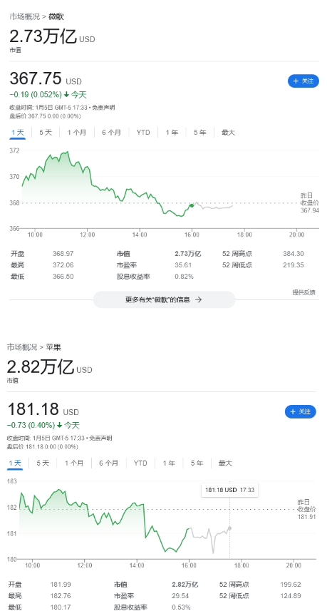 目前微軟公司市值為 2.73 萬(wàn)億美元(備注:當前約 19.57 萬(wàn)億元人民幣),蘋(píng)果公司市值 2.82 萬(wàn)億美元(當前約 20.22 萬(wàn)億元人民幣),兩者僅約 1000 億美元(當前約 7170 億元人民幣)。