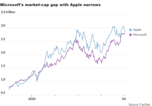 與蘋(píng)果公司相比,微軟公司今年的股價(jià)走勢稍強,2023 年上漲了 57%,而蘋(píng)果公司上漲了 48%,且微軟股價(jià)在 2024 年初的跌幅也較小。