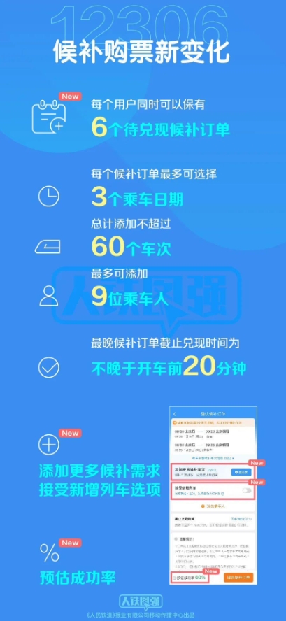一是增加候補訂單數量。每名旅客可提交的待兌現候補訂單數量由 2 個(gè)增至 6 個(gè),每個(gè)訂單最多可添加 9 名乘車(chē)人。