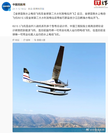 近日,全球首架水上電動(dòng)飛機 RX1E-S 在全球第二大水利發(fā)電站 —— 云南省巧家縣金沙江白鶴灘水電站開(kāi)飛。