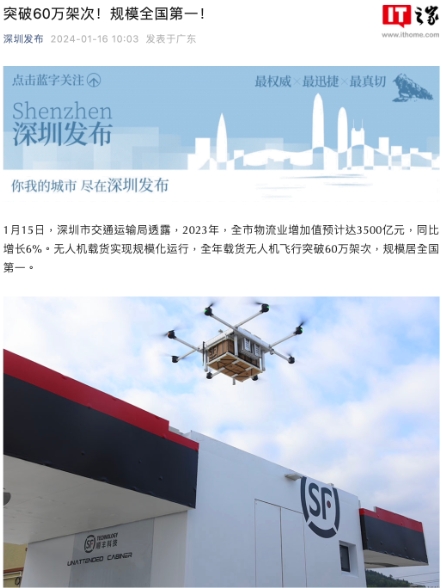 據“深圳發(fā)布”官方公眾號消息,深圳市交通運輸局昨日透露,2023 年深圳市物流業(yè)增加值預計達 3500 億元,同比增長(cháng) 6%。無(wú)人機載貨實(shí)現規?;\行,全年載貨無(wú)人機飛行突破 60 萬(wàn)架次,規模居全國第一。