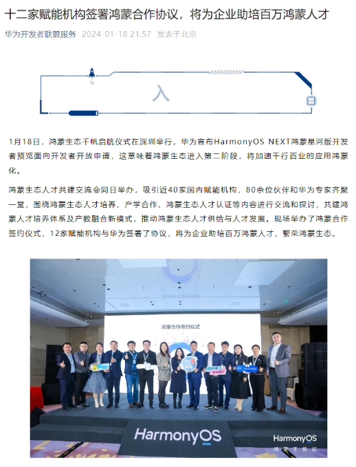 本次活動(dòng)上有 12 家機構與華為簽署了鴻蒙人才合作協(xié)議,包括北京中軟國際教育科技股份有限公司、北京軟通動(dòng)力教育科技有限公司、北京博海迪信息科技股份有限公司、北京千鋒互聯(lián)科技有限公司、青軟創(chuàng )新科技集團股份有限公司、濟南博賽網(wǎng)絡(luò )技術(shù)有限公司、江蘇傳智播客教育科技股份有限公司、福州市傳一卓躍職業(yè)技能培訓學(xué)校有限公司、江蘇潤開(kāi)鴻數字科技有限公司、深圳市訊方技術(shù)股份有限公司、達內時(shí)代科技集團有限公司、江西幻云信息科技有限公司。