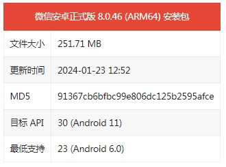 微信安卓平臺迎來(lái)了 8.0.46 正式版更新,本次更新安裝包文件詳細信息如下: