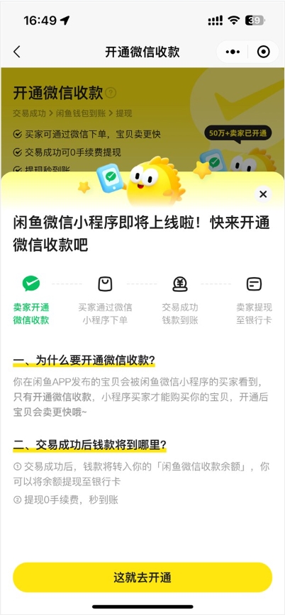 根據開(kāi)通微信收款頁(yè)面顯示,交易成功后,錢(qián)款將轉入商家閑魚(yú)微信收款余額。商家可將此余額提現至銀行卡,并聲稱(chēng)0手續費,秒到賬。