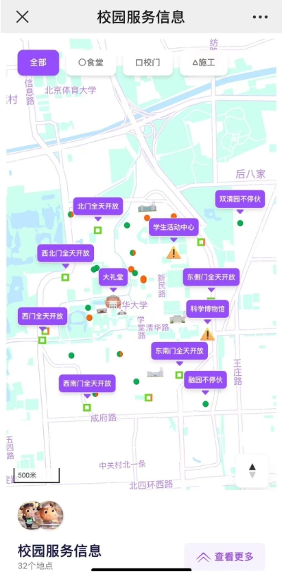 社會(huì )公眾入校前后可在清華大學(xué)官方網(wǎng)站下載使用校園地圖,按照地圖上的圖示指引,規劃游學(xué)路線(xiàn)。此外,“清華后勤”企業(yè)號底部菜單欄“服務(wù)平臺”頻道嵌入【行在清華】板塊,新增【服務(wù)地圖】欄目,校園服務(wù)信息可以一鍵獲得。