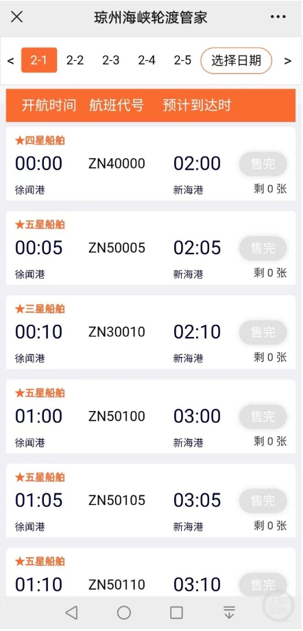 預訂平臺顯示,近期徐聞港至??诘男履茉窜?chē)型票已售完。平臺截圖