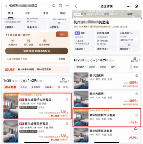 飛豬App端(左)和小程序端(右)預定杭州某酒店豪華城景特大床客房?jì)r(jià)格不同