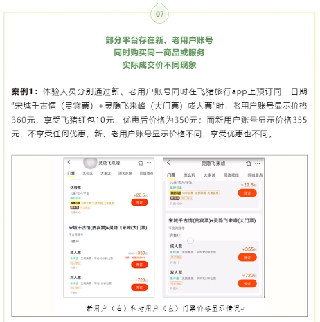 北京市消協(xié)通報案例中顯示,部分平臺存在新、老用戶(hù)賬號同時(shí)購買(mǎi)同一商品或服務(wù),實(shí)際成交價(jià)不同現象。體驗人員分別通過(guò)新、老用戶(hù)賬號同時(shí)在飛豬旅行app上預訂同一日期“宋城千古情(貴賓票)+靈隱飛來(lái)峰(大門(mén)票)成人票”時(shí),老用戶(hù)賬號顯示價(jià)格360元,享受飛豬紅包10元,優(yōu)惠后價(jià)格為350元;而新用戶(hù)賬號顯示價(jià)格355元,不享受任何優(yōu)惠,新、老用戶(hù)賬號顯示價(jià)格不同,享受優(yōu)惠也不同。