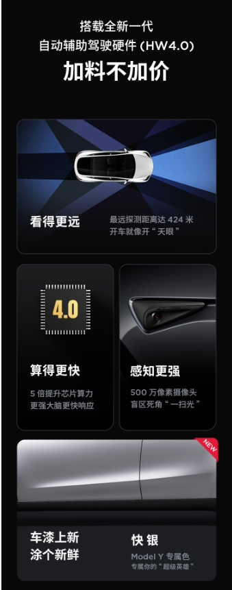 加量不加價(jià):特斯拉 Model Y 升級 HW4.0 輔助駕駛硬件,同時(shí)推出 8000 元新春優(yōu)惠、2000 元選配“快銀”車(chē)漆等政策