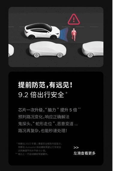 升級 HW 4.0 之后,特斯拉 Model Y 將擁有“5 倍提升芯片算力”,最遠探測距離可達 424 米,而且支持 500 萬(wàn)像素攝像頭,從而實(shí)現“9.2 倍出行安全”,支持自動(dòng)輔助導航駕駛、自動(dòng)輔助轉向、自動(dòng)緊急制動(dòng)、側撞預警、前撞預警、自動(dòng)遠光燈等功能。