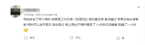 “特地多定了兩個(gè)鬧鐘,結果是工作日周一到周五的,調休真無(wú)語(yǔ),差點(diǎn)睡過(guò),蘋(píng)果沒(méi)有安卓智能,鬧鐘可以定節假日”