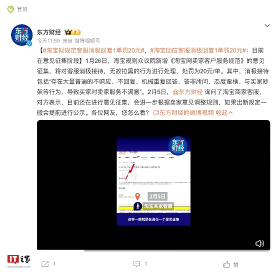 “淘寶擬規定客服消極回復 1 單罰 20 元”微博話(huà)題引熱議,官方回應“正處于意見(jiàn)征集期” 09:24:10