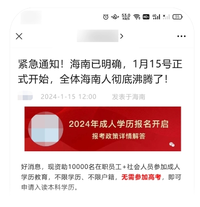標題宣稱(chēng)緊急通知,明確指向“全體海南人”,誤導該群體用戶(hù)以為出臺與其相關(guān)的政策,而正文實(shí)則是教育課程營(yíng)銷(xiāo)廣告,也并未限制區域。
