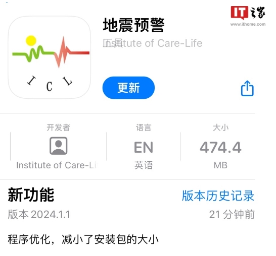 “地震預警”蘋(píng)果 iOS 版 App 發(fā)布 2024.1.1 更新:體積大幅縮減至 474.4MB